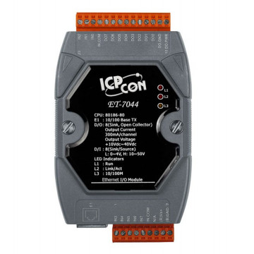 The module ET-7044 CR provides 8 wet contact digital inputs and 8 sink-type digital outputs. It features optical isolation for 3750 Vrms of transient overvoltage protection but doesn’t provide channel-to-channel isolation.