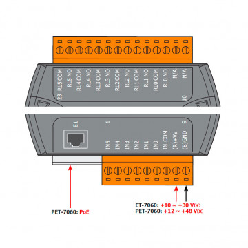 The ET-7060 provides 6 wet contact digital inputs and 6 form A electromechanical relays. It features optical isolation for 3000 VDC of transient overvoltage protection and doesn’t have channel-to-channel isolation.